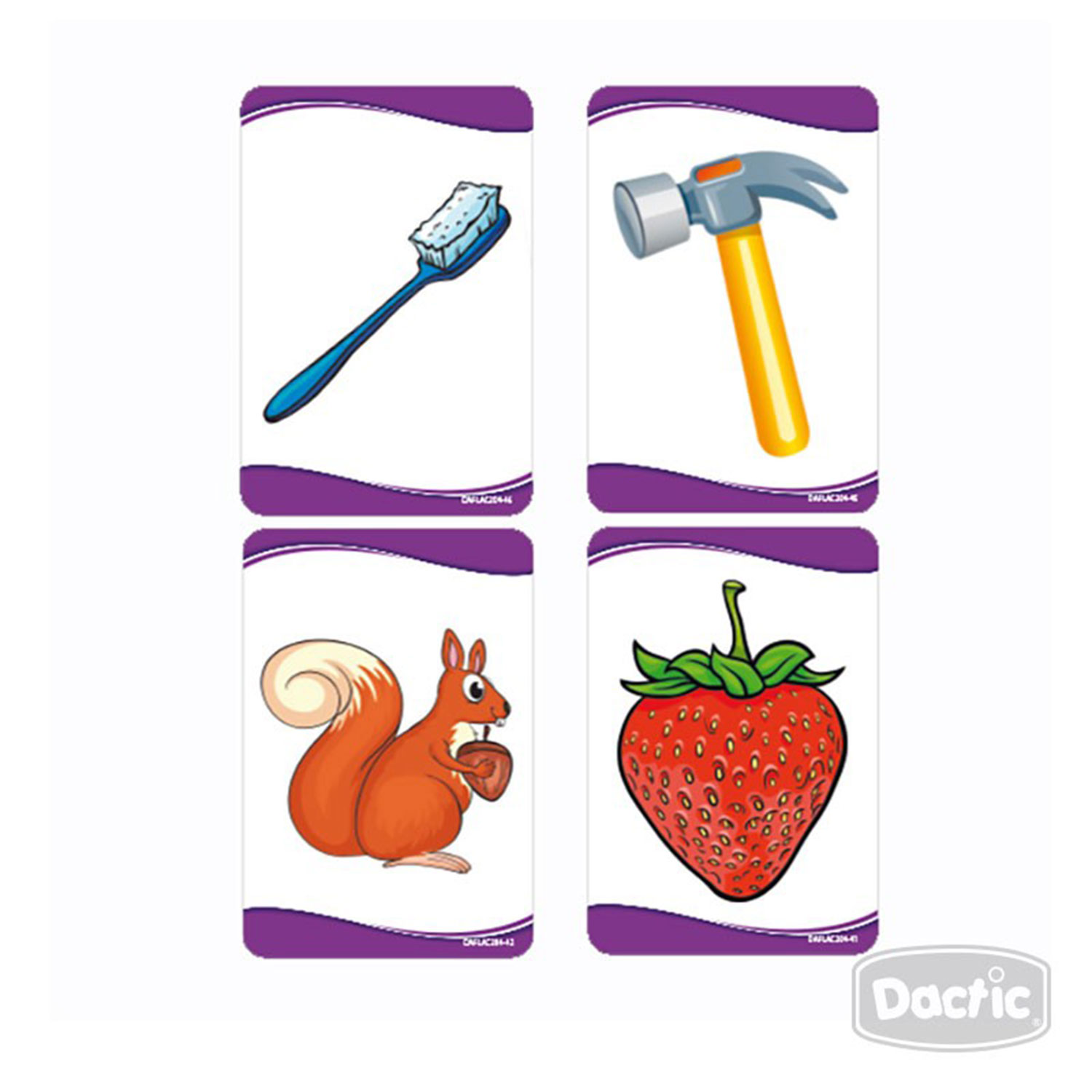 Nuestras prácticas láminas didácticas permiten desarrollar la conciencia fonológica mediante la asociación de imágenes de objetos, cosa o animales que tengan igual sonido inicial y final.
