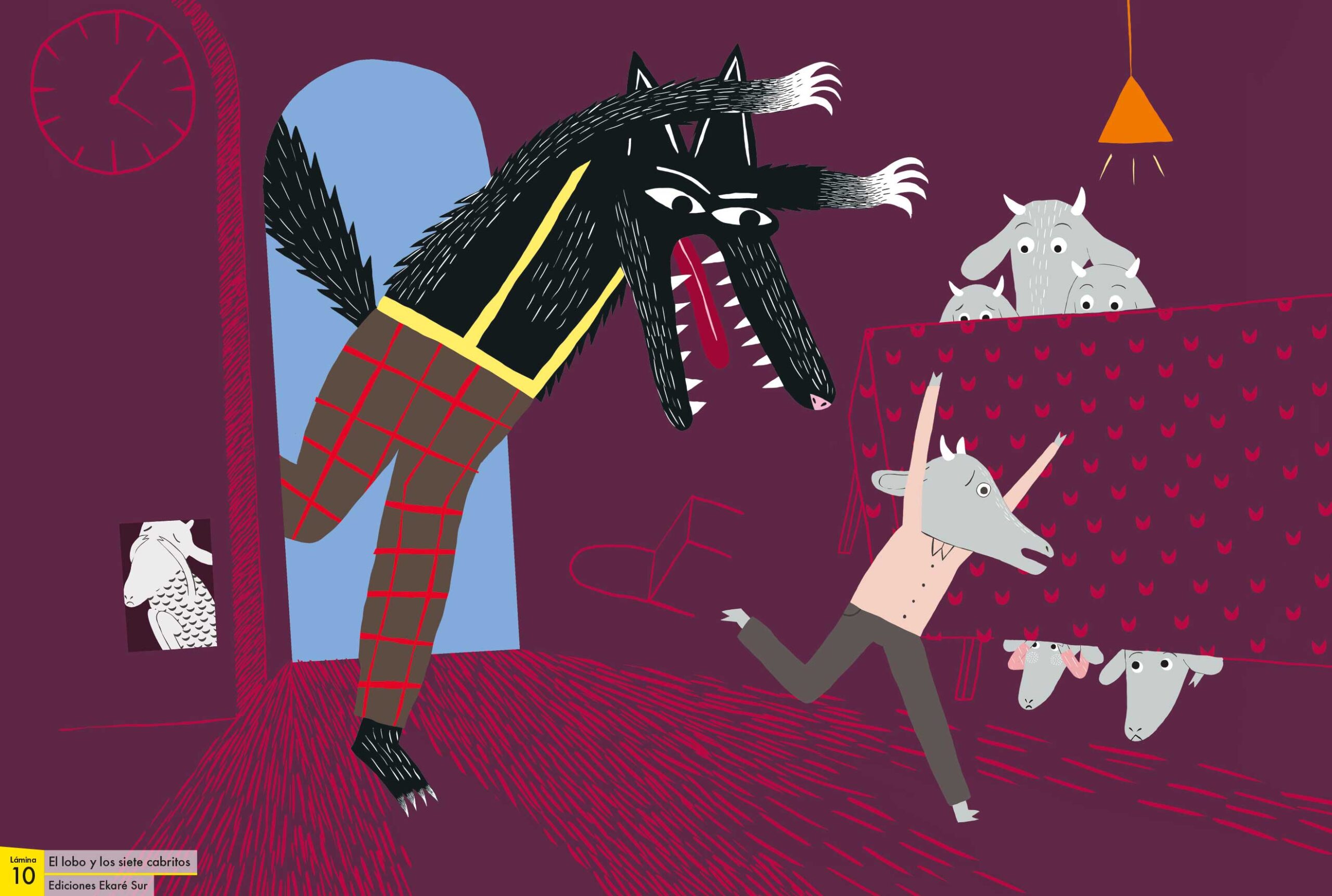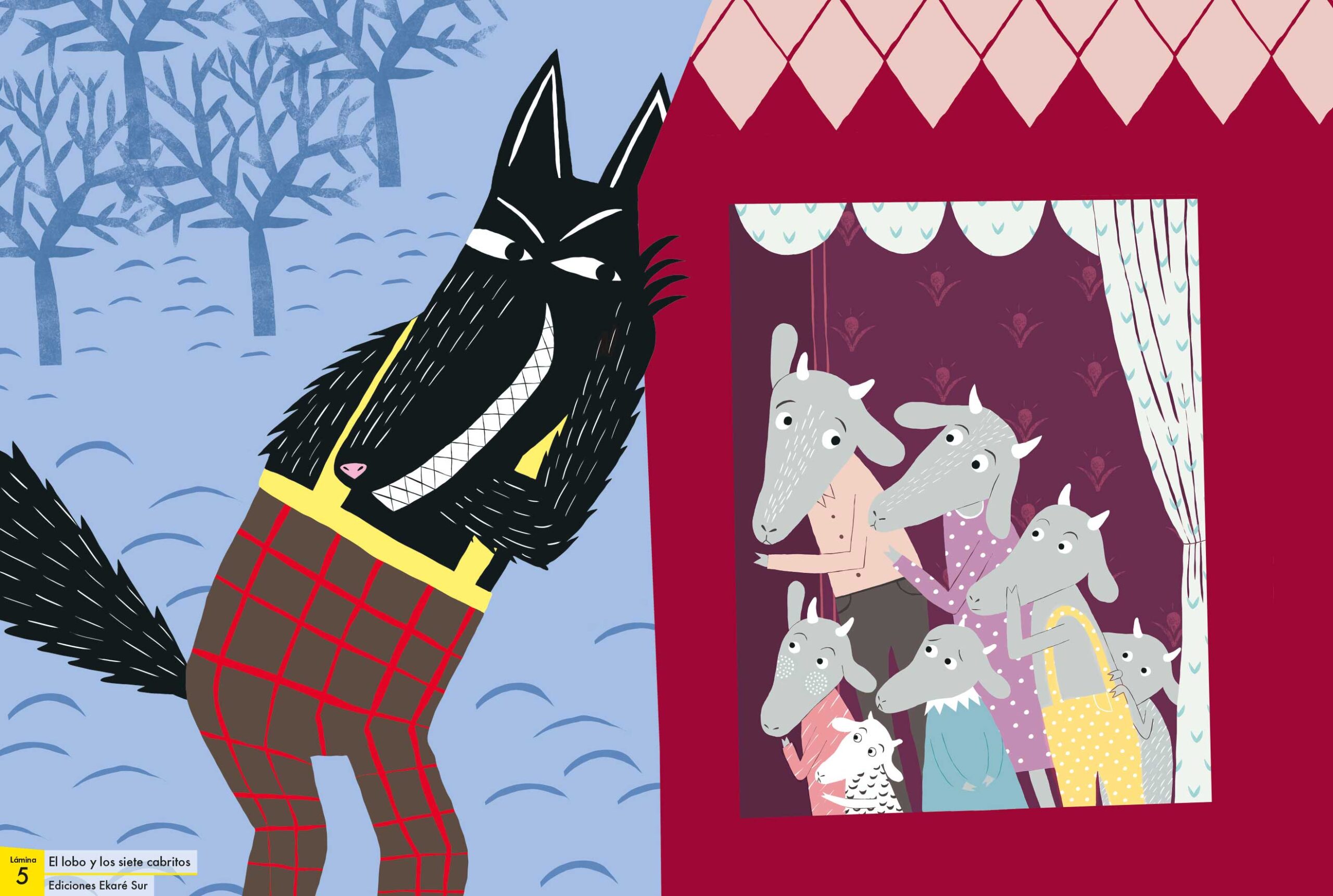 Originalmente rescatado de la tradición oral y publicado por los Hermanos Grimm, este relato presenta el encuentro entre un mal intencionado lobo y siete cabritos dejados a solas en casa por la mamá. A pesar de todos los consejos de la mamá cabra para que no le abrieran la puerta a nadie, los críos terminan engañados por el malvado lobo que logra entrar en la casa. El único que escapa es el más pequeñito, que se esconde muy bien. Será del benjamín la misión de contar a la mamá todo lo que ha pasado e intentar salvar a los hermanos capturados por el villano.