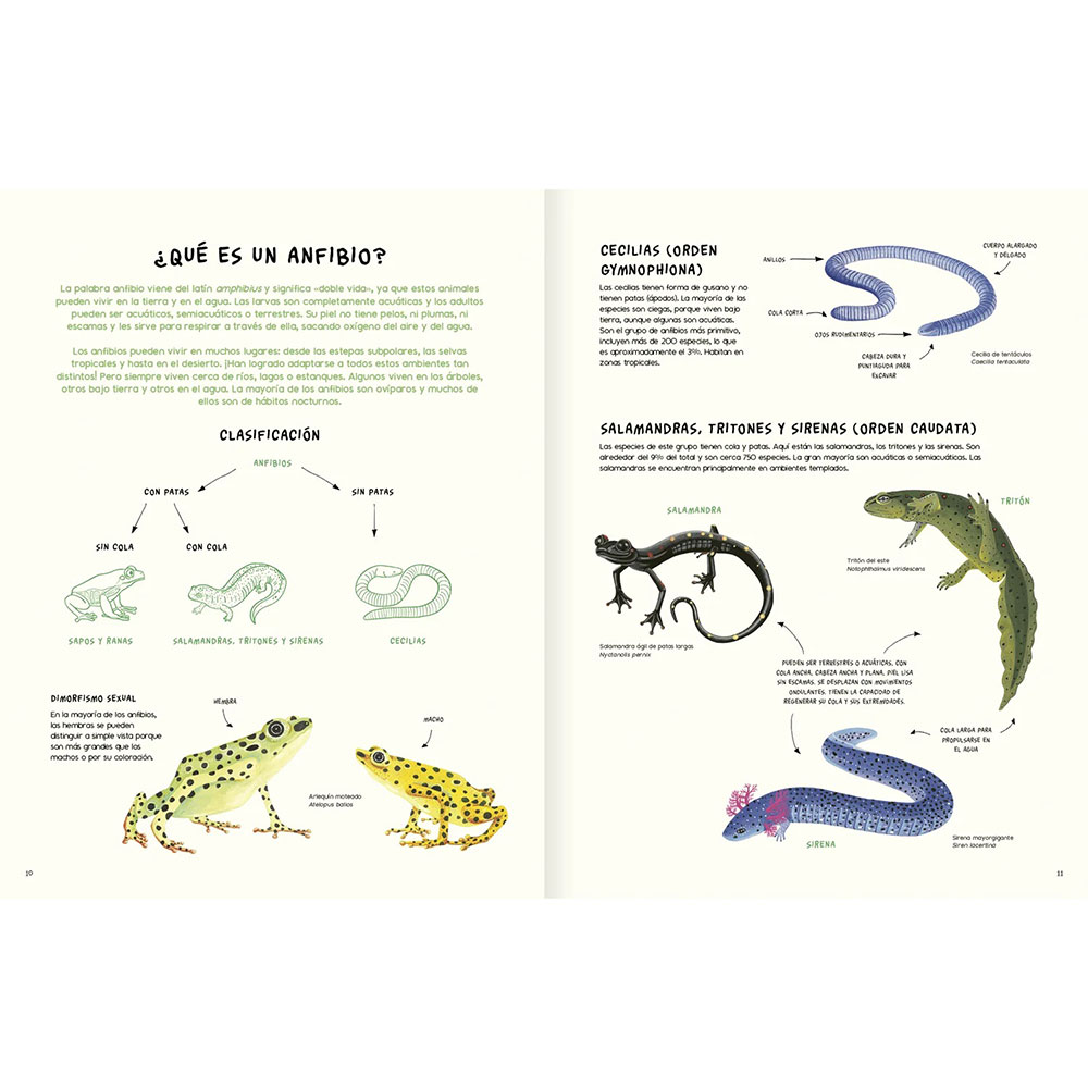 Los reptiles y los anfibios son criaturas fascinantes y sorprendentes, que llevan millones de años en la tierra, pero ¿qué sabemos de ellos? ¿Dónde viven? ¿Cómo lo hacen? En este libro, Martha Crump y Andrés Charrier, dos especialistas en el tema, responden estas preguntas y nos cuentan muchas más cosas sobre estos peculiares habitantes de nuestro planeta. Las atractivas y hermosas ilustraciones a cargo de Loreto Salinas nos ayudarán a sumergirnos en su mundo, invitándonos a conocer y comprender aspectos básicos, y algunos más complejos, de los reptiles y anfibios de América. Es un libro para todas las edades, para admirar lo fantástica que es la evolución, los procesos de adaptación de las especies y la gran diversidad de la vida en la tierra. Un libro entretenido, sorprendente, didáctico y bello.