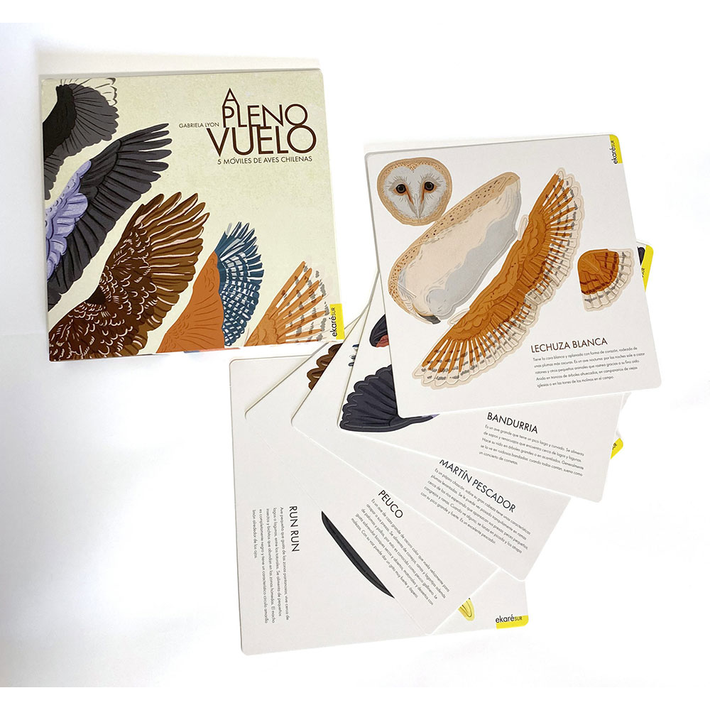 Numerosas aves acompañan al protagonista de 9 kilómetros en su recorrido. Entre ellas están el run run, la bandurria, el peuco, el martín pescador y la lechuza blanca, cinco aves que, ilustradas por Gabriela Lyon, conforman esta colección de móviles para armar y colgar. El set incluye el nombre científico de cada especie, su tamaño y distribución en Chile, además de una descripción de sus principales características.