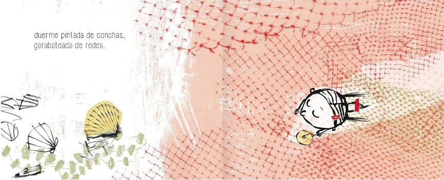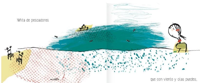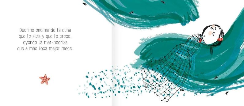 Duerme encima de la duna // que te alza y que te crece, // oyendo a la mar-nodriza // que a más loca a más mece. Las bellas palabras de Gabriela Mistral sobre el mar y las pescadoras son acompañadas en esta hermosa edición por las ilustraciones de Mercè Galí.