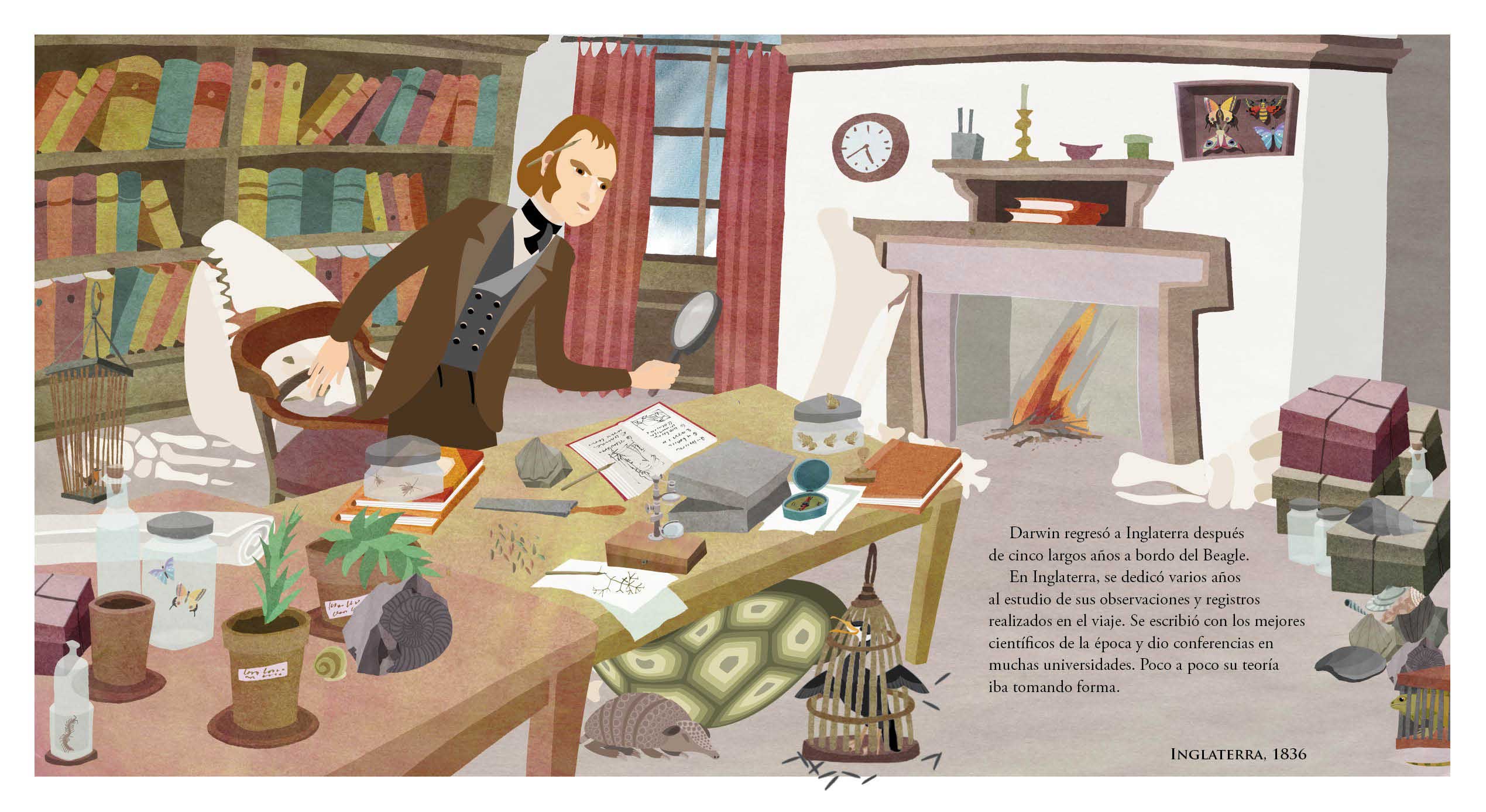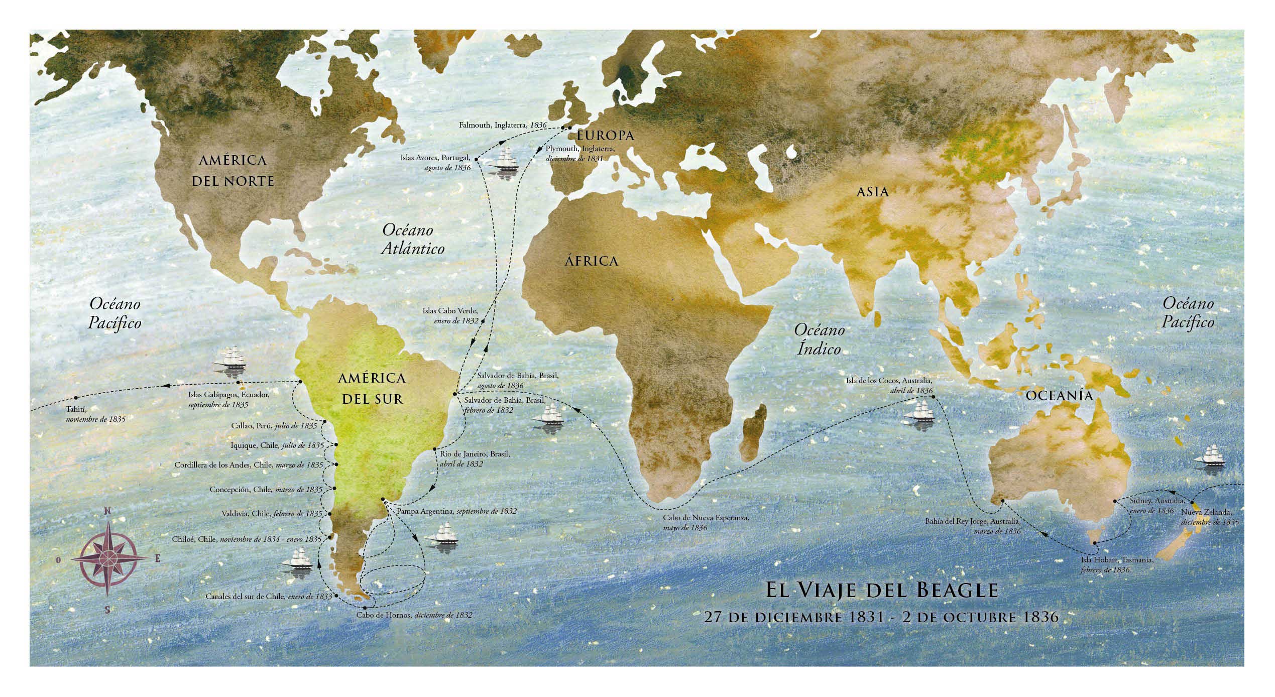 En 1832, Charles Darwin realizó un viaje a bordo del Beagle, desde Inglaterra hacia las costas de América del Sur. Su paso por la pampa argentina, el sur y centro de Chile, junto con las Islas Galápagos entregaron elementos importantes para la idea de la evolución de las especies.