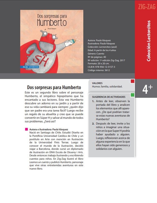 Humberto, el hipopótamo, recibe en este nuevo libro dos sorpresas, una de ellas le exige asumir el rol de papá y comprender que a veces es mucho más complejo de lo que parece; y en la otra, un regalo de su abuelita lo transforma en superhéroe y con esto siente que su misión en salvar al mundo, pero… ¿será que realmente lo logra?