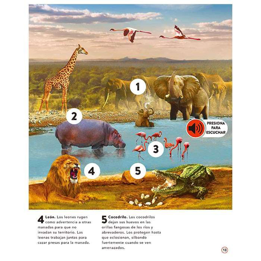 El libro reino Animal, es extraordinariamente interactivo, presiona y activa las páginas para escuchar 50 gruñidos, bufidos, chillidos y graznidos diferentes. ¡Un safari como nunca antes lo habías escuchado!