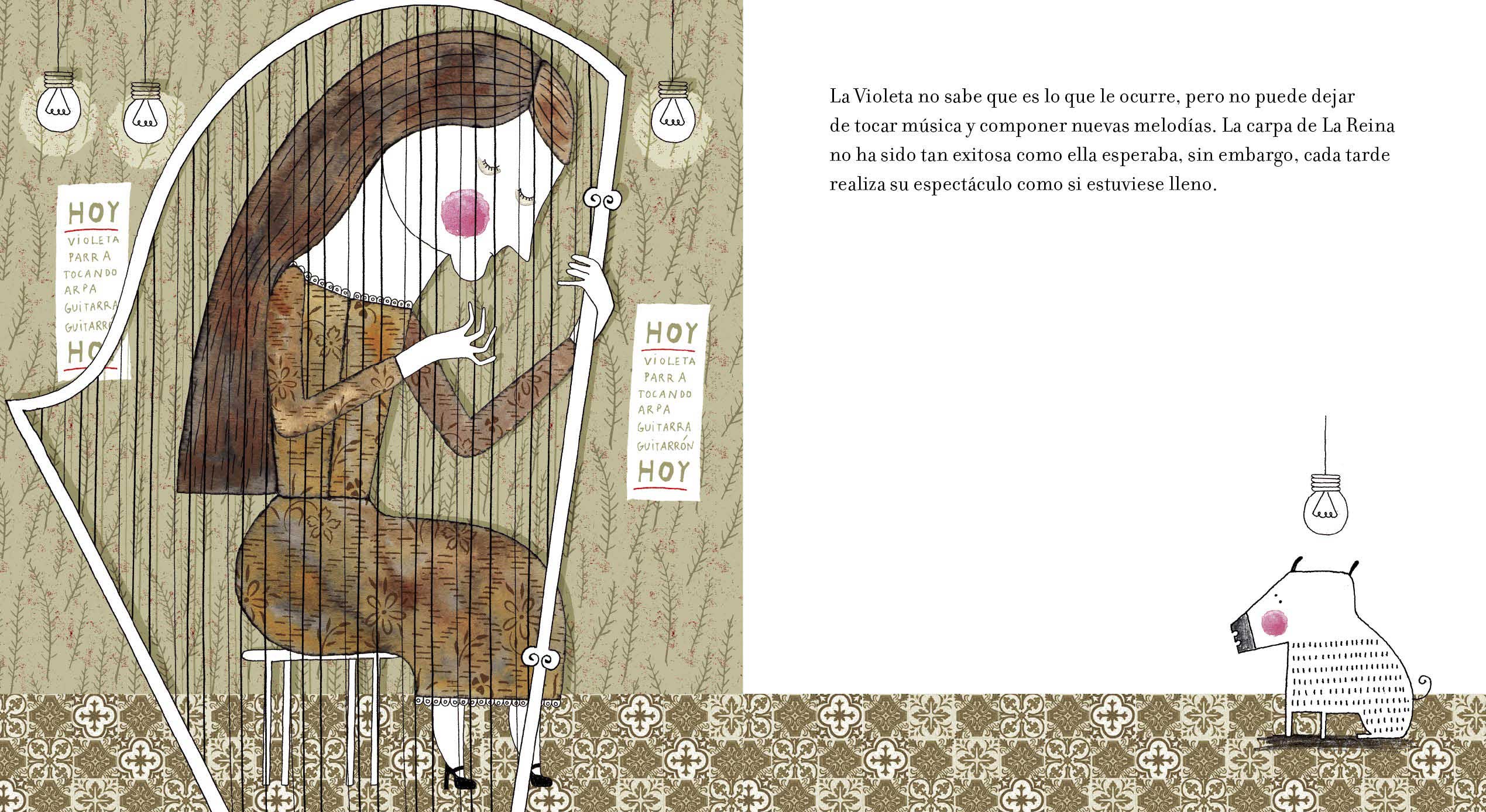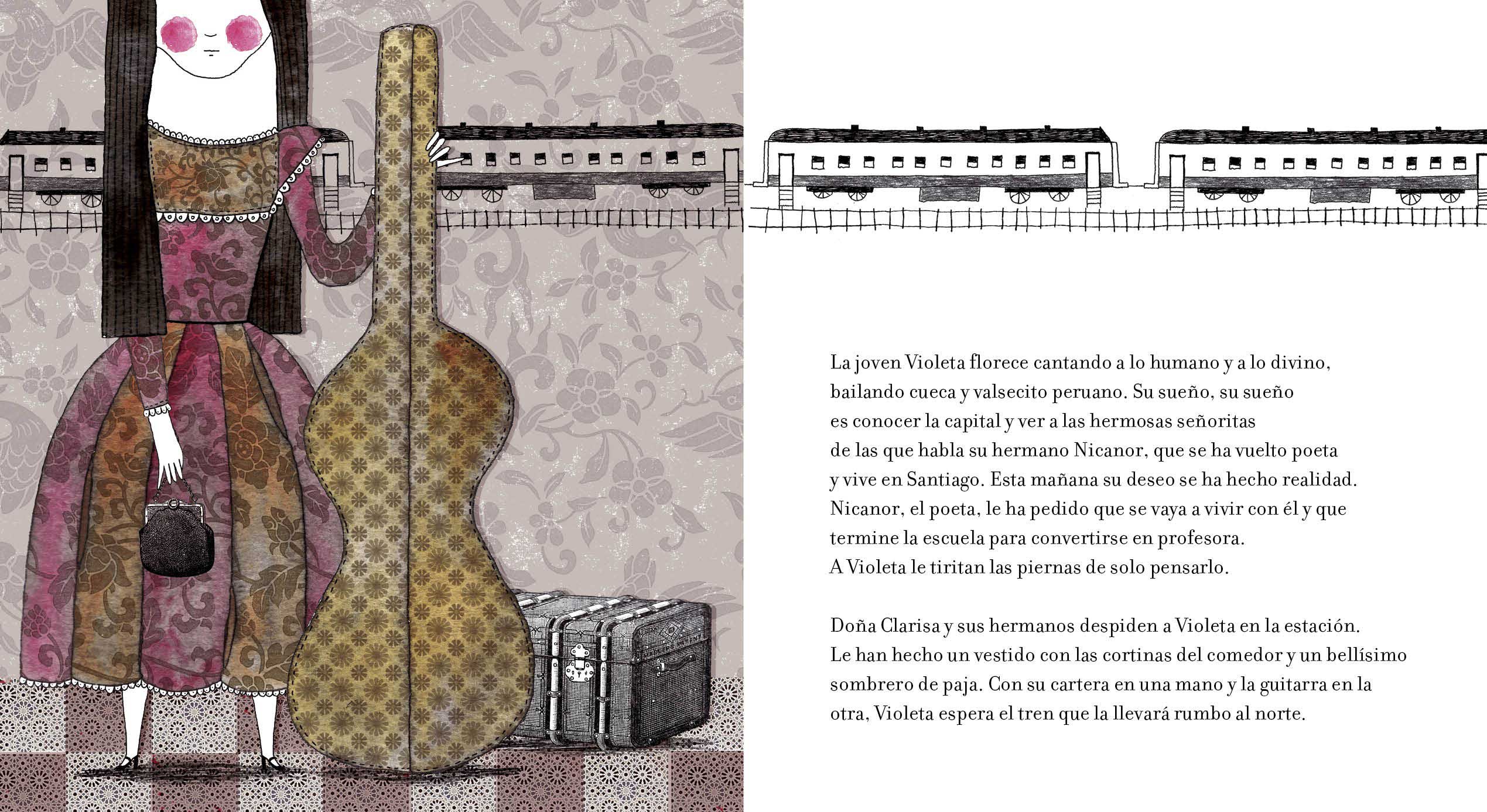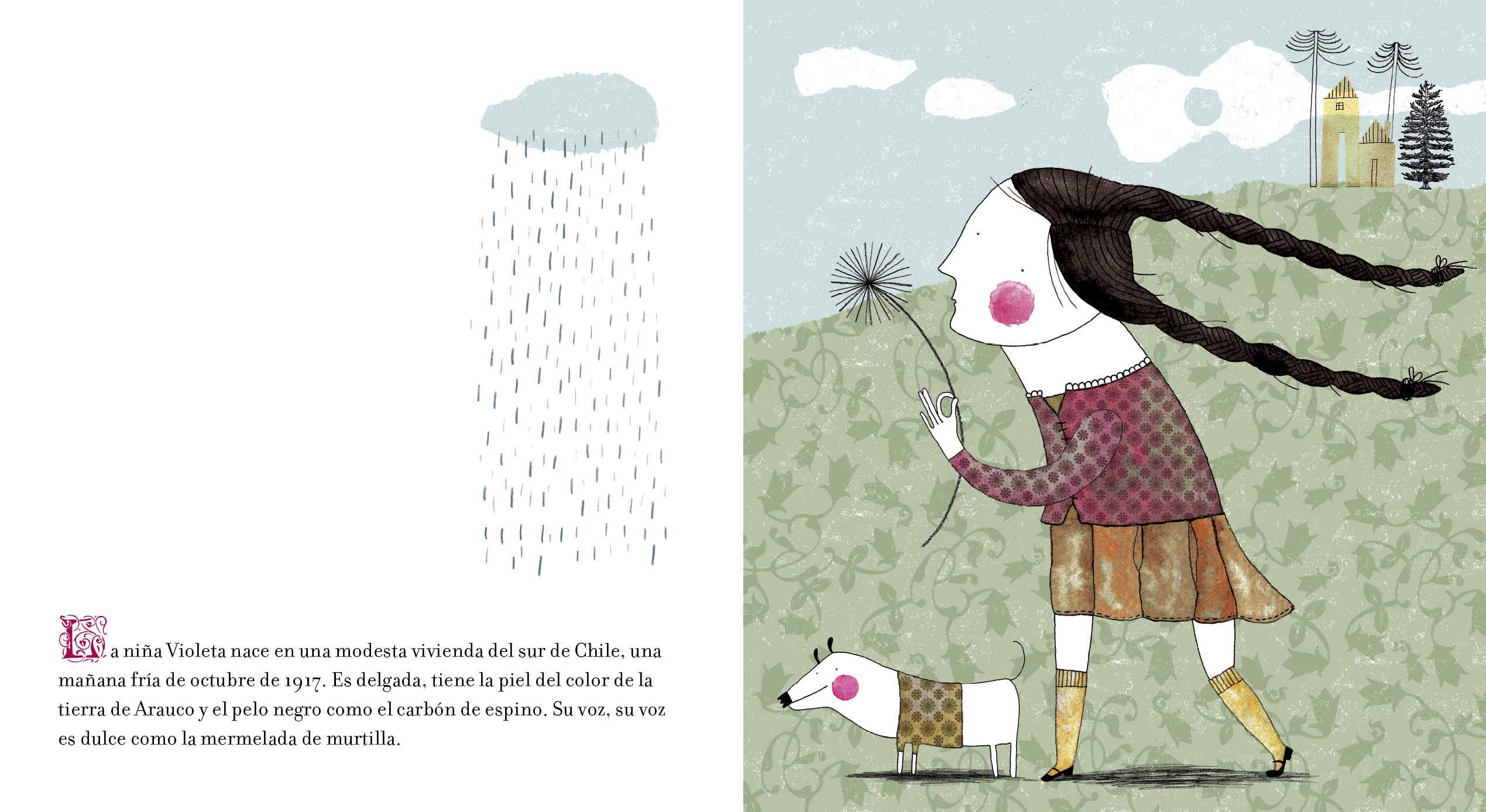 Esta es la historia de Violeta Parra, una niña que florece campesina y cantora. De grande Violeta no para de cantar. Recorre el mundo con sus canciones y se hace famosa. Pinta, teje y borda arpilleras.