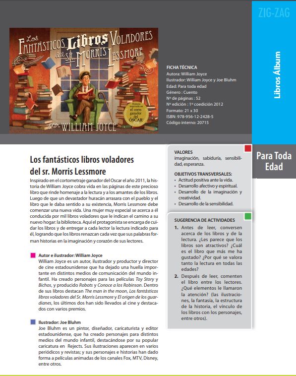 Inspirado en un cortometraje ganador de un Oscar, este libro rinde homenaje a la lectura y a los amantes de los libros. Luego de que un devastador huracán arrasara con el pueblo y el libro que le daba sentido a su existencia, Morris Lessmore debe comenzar una nueva vida. Una mujer muy especial se acerca a él conducida por mil libros voladores que le indican el camino a su nuevo hogar: la biblioteca. Aquí el protagonista se encarga de cuidar los libros y de entregar a cada lector la lectura indicada