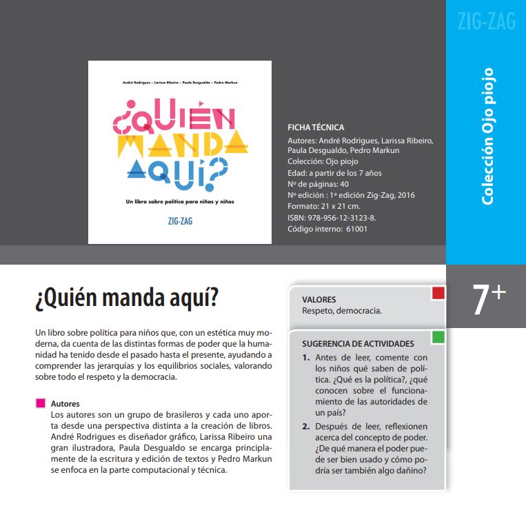 ¿Quién manda aquí? Es un libro sobre política para niños que, con una estética muy moderna, da cuenta de las distintas formas de poder que la humanidad ha tenido desde el pasado hasta el presente, ayudando a comprender las jerarquías y los equilibrios sociales, valorando sobre todo el respeto y la democracia.