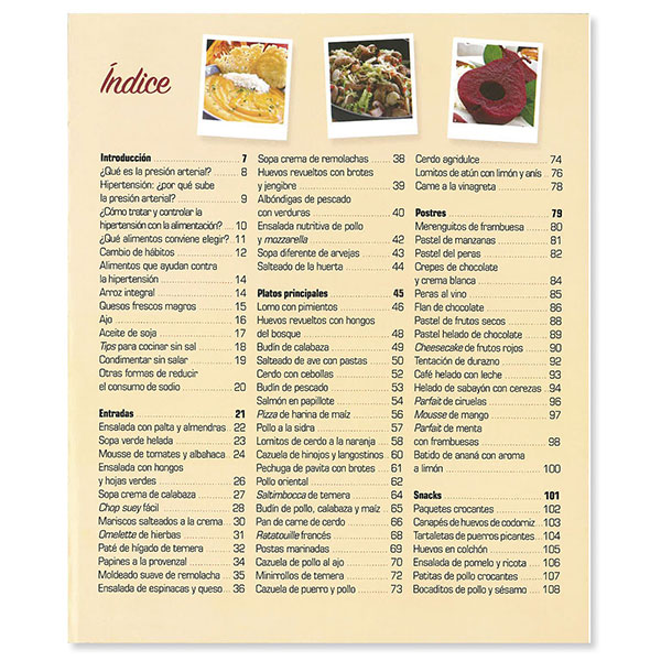 Reseña del libro: Te ofrece variadas opciones para lograr una dieta balanceada, sin sacrificar el delicioso sabor de sus comidas. Sus útiles consejos y tips le ayudarán a escoger alimentos con bajo contenido de sodio, combatir la hipertensión y mejorar su calidad de vida. ¿Lo mejor? … ¡Qué también sirve para adelgazar!