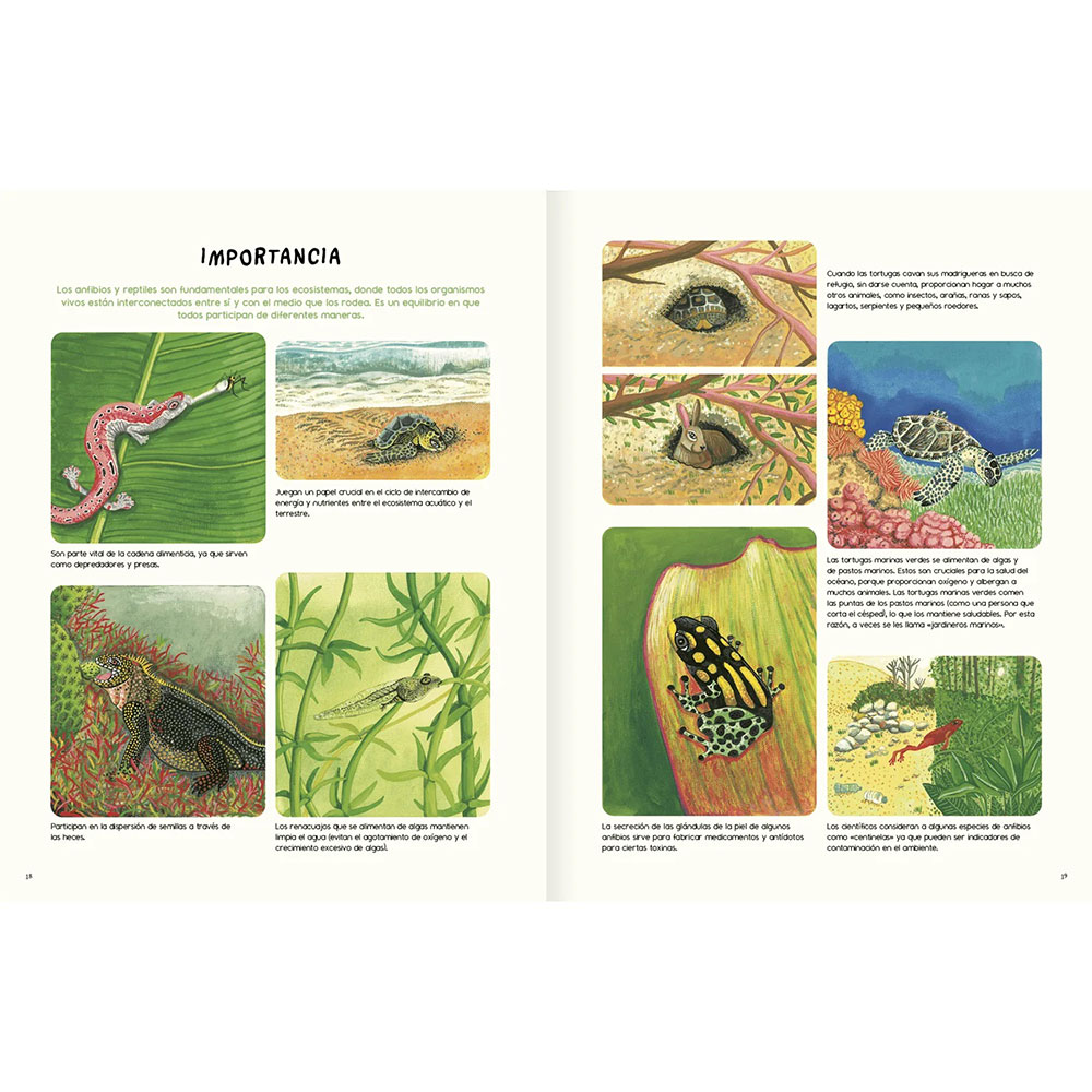 Los reptiles y los anfibios son criaturas fascinantes y sorprendentes, que llevan millones de años en la tierra, pero ¿qué sabemos de ellos? ¿Dónde viven? ¿Cómo lo hacen? En este libro, Martha Crump y Andrés Charrier, dos especialistas en el tema, responden estas preguntas y nos cuentan muchas más cosas sobre estos peculiares habitantes de nuestro planeta. Las atractivas y hermosas ilustraciones a cargo de Loreto Salinas nos ayudarán a sumergirnos en su mundo, invitándonos a conocer y comprender aspectos básicos, y algunos más complejos, de los reptiles y anfibios de América. Es un libro para todas las edades, para admirar lo fantástica que es la evolución, los procesos de adaptación de las especies y la gran diversidad de la vida en la tierra. Un libro entretenido, sorprendente, didáctico y bello.